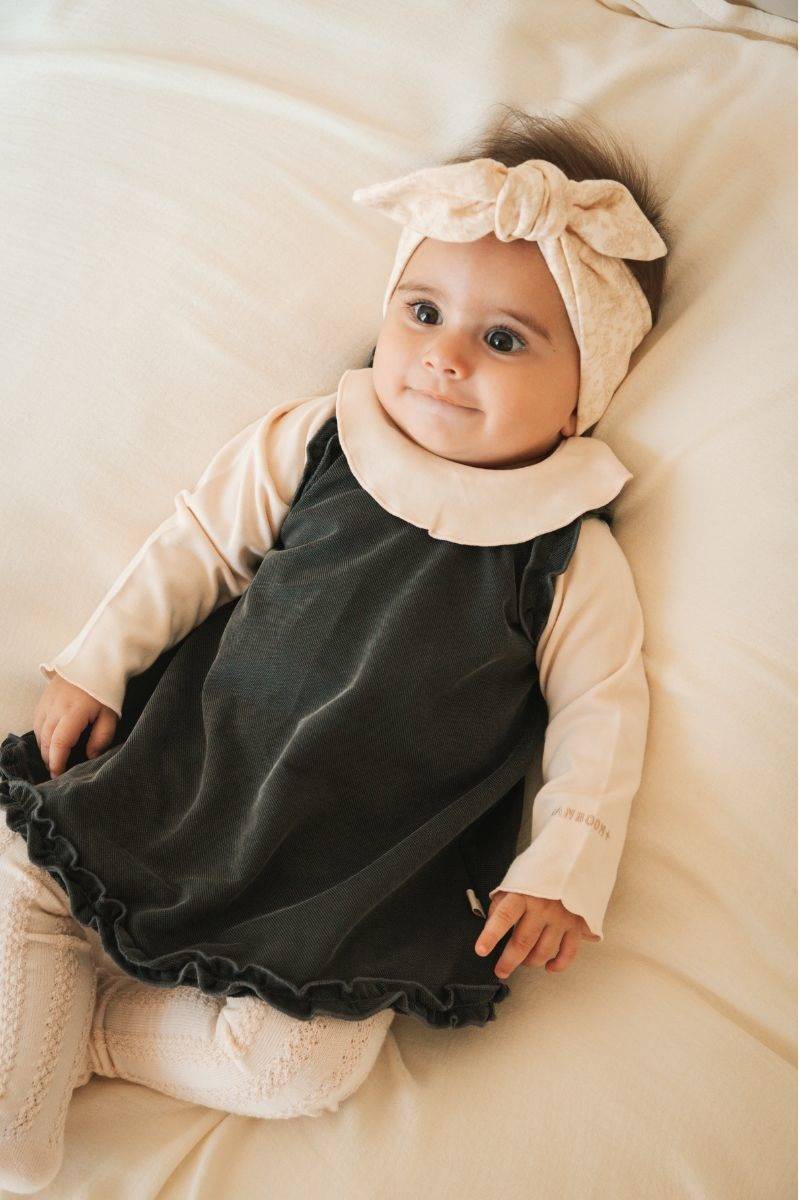 Боди за девојче со украсен коланоколу вратот, изработено од бамбус вискоза и памук. Исклучително меко, дишечко и пријатно за чувствителна бебешка кожа, совршено за секојдневно носење или посебни пригоди. Комбинира удобност и елегантен изглед, со практично закопчување за лесно облекување.