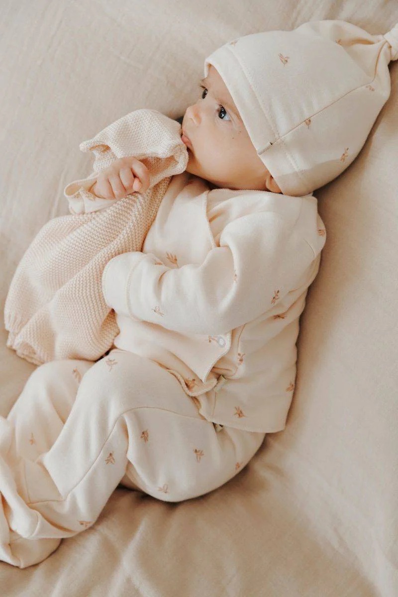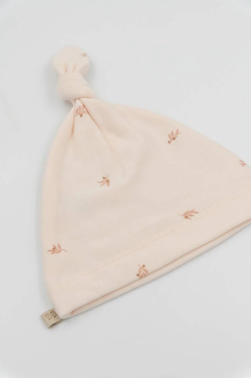 Мека бебешка капа со јазол во, изработена од бамбус вискоза и органски памук — природни, дишечки и нежни материјали кои се пријатни за чувствителната кожа на новороденчето. Капата е удобна, практична и стилски додаток што ја штити главата на бебето и го комплетира секојдневниот изглед