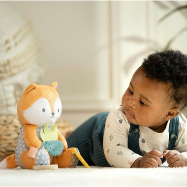 Меко плишано лисиче Kitt што ја смирува и забавува бебето дома или на патување. Со различни текстури, крцкави делови и играчки, оваа плишана играчка поттикнува истражување и сензорно учење, додека меките материјали ја нудат потребната удобност за мали рачиња. Лесно се прикачува со ткаена лента за игра во движење.
