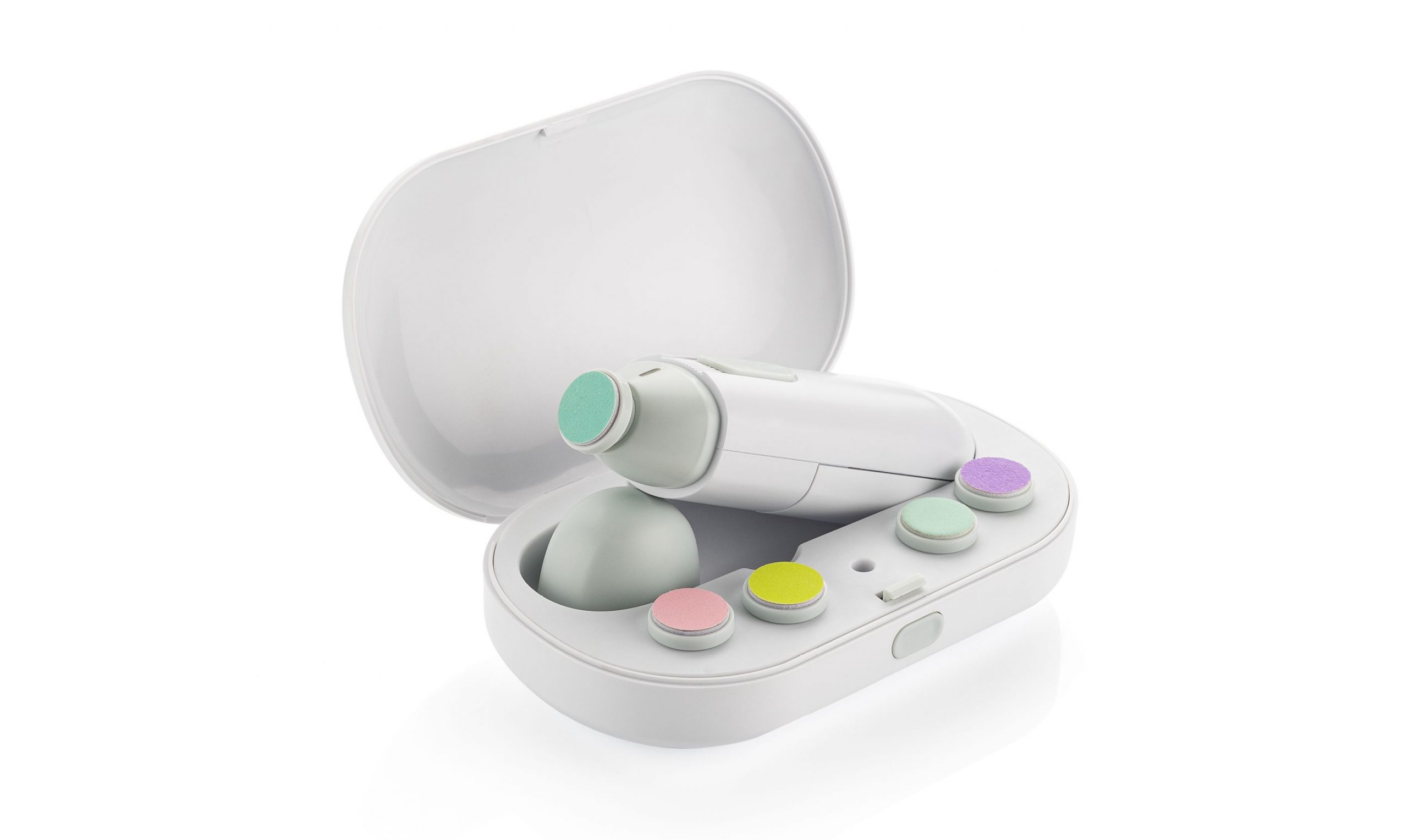 Турпијата доаѓа со пет различни додатоци прилагодени на различни возрасни групи, па можете лесно да изберете соодветен за деликатните нокти на новороденчиња и подоцна за постари бебиња и мали деца. Има две брзински поставки – побавна за најнежните нокти и побрза за подоцврсти нокти или педикир. Во практичната кутија за чување се вклучени: турпијата, пет додатоци, 2 AAA батерии и кутија за организација, што го прави уредот погоден и за патување или носење со вас.