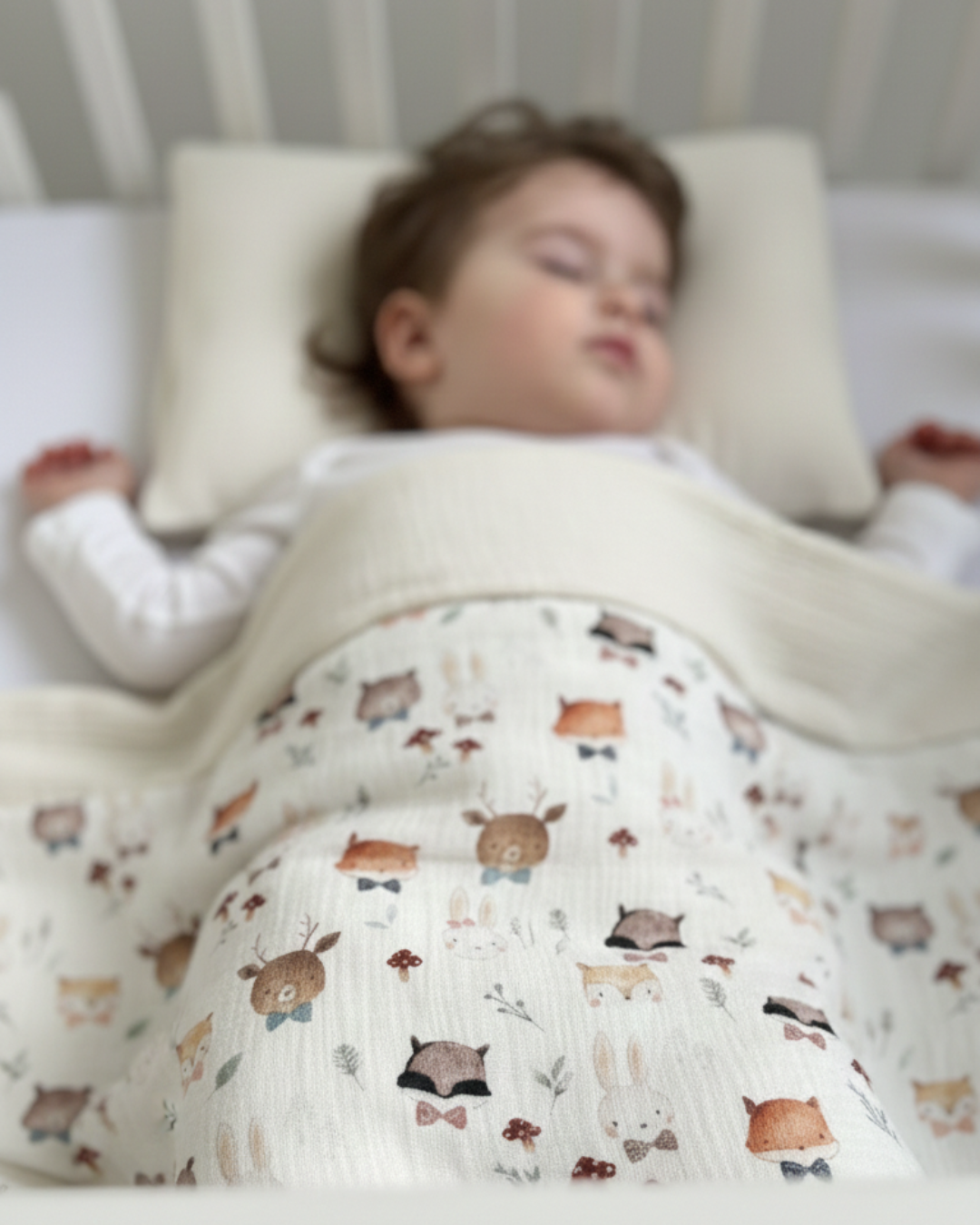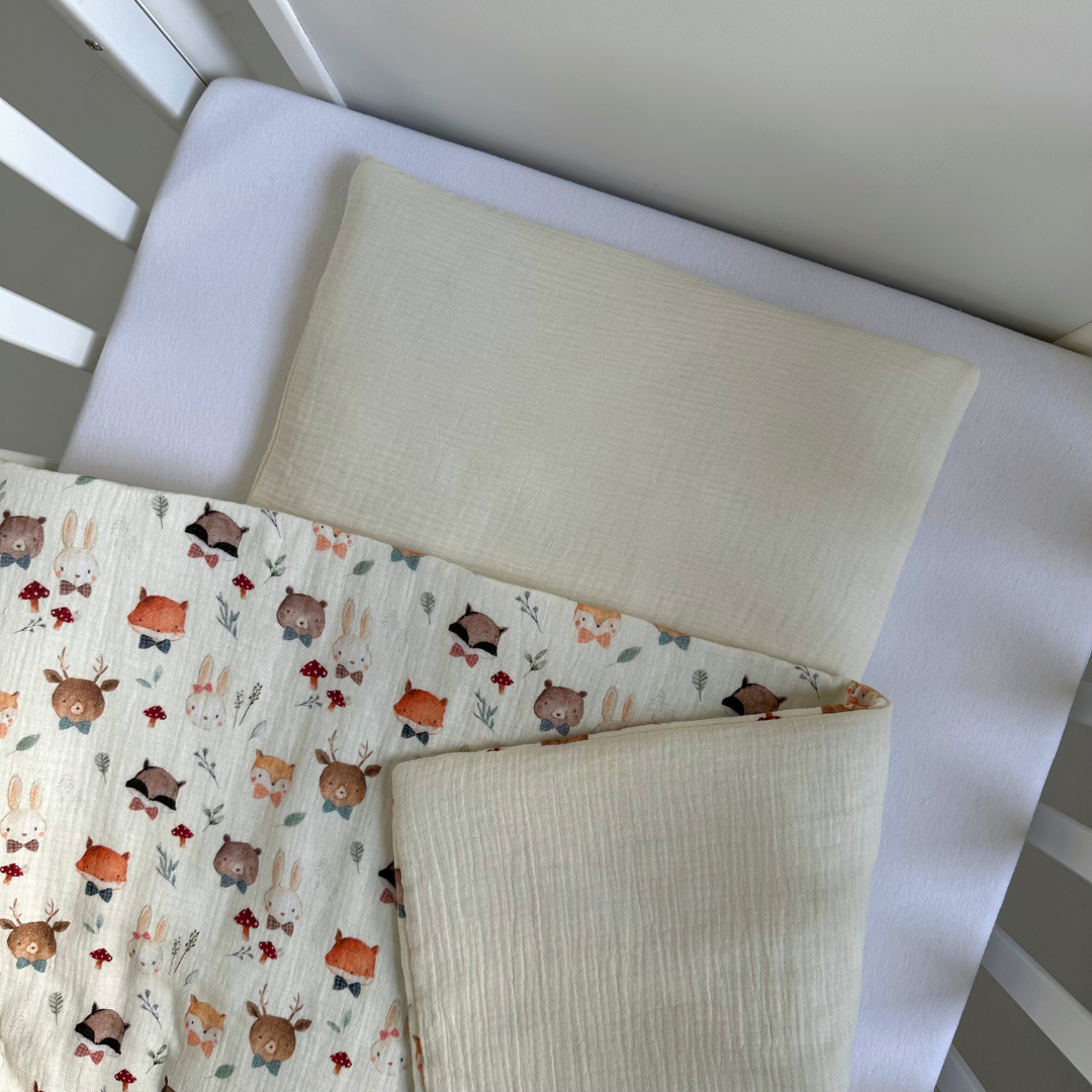 Овој сет муслин постелнина од два дела е совршен за удобен и пријатен сон на вашето бебе. Изработен од 100% памучен муслин, обезбедува мекост и топлина без прегревање. Муслинот е природен материјал што го прави спиењето пријатно и нежно за чувствителната бебешка кожа.