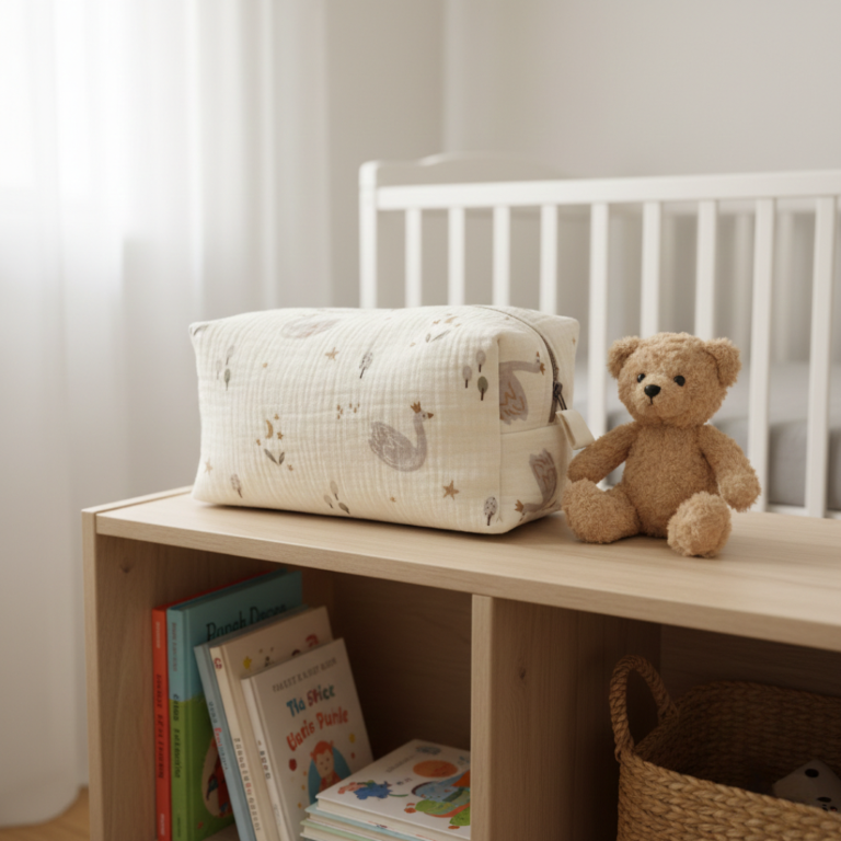 Практичен и стилски несесер изработен од мек и квалитетен муслин. Со димензии 43 × 36 × 13 cm.
